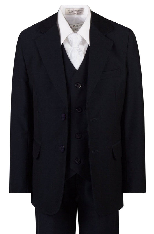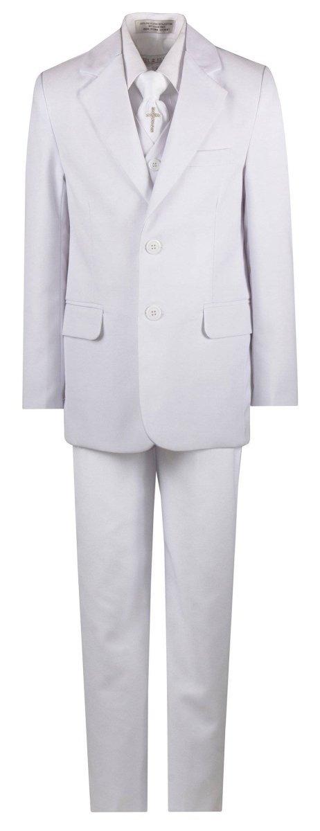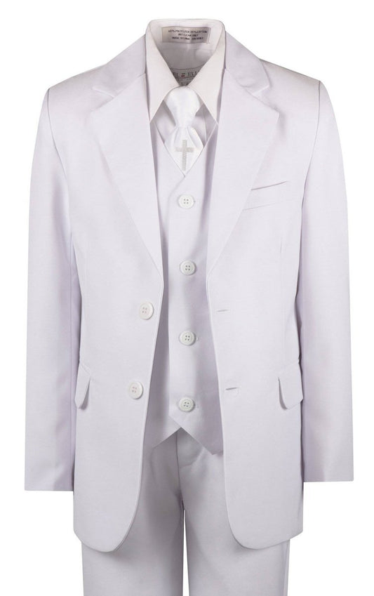 Traje de comunión de cinco piezas de corte entallado con corbata y pañuelo blancos